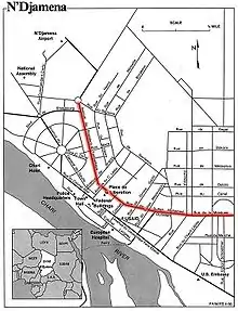 While many formerly French street names in Chad were Africanized during the Authenticité program under the presidency of François Tombalbaye, including the city itself (formerly Fort Lamy), the avenue was described as an exception to this in 1974.[10] However, a 1986 map[11] shows what is now the Avenue Charles de Gaulle labelled with three different names "Avenue du President Tombalbaye", "Rue du Sultan Mohamed Ouradah" and "Rue de la Mosquee".