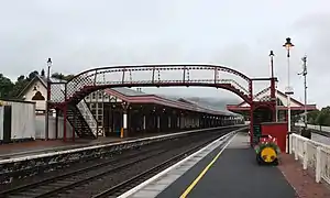 The station has a passing loop 40 chains (800 m) long, flanked by two platforms. Platform 1 on the down (northbound) line can accommodate trains having fourteen coaches, whereas platform 2 on the up (southbound) line can hold fifteen.[11] The junction between the Strathspey Railway and Network Rail lies to the south of the station and was controlled from the station signal box, which also controlled a large portion of the main line either side of here (from Kingussie all the way to Culloden Moor since 1979) as well as the immediate station area.[12] The station was resignalled and the loop extended in 2019, which also saw the signal box closed with control transferring to Inverness.[13]