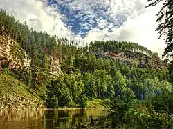The Ay (Bashkir: Әй, Äy; Russian: Ай) is a river in Bashkortostan and Chelyabinsk Oblast in Russia, a left tributary of the Ufa. The river is 549 kilometres (341 mi) long, and its drainage basin covers 15,000 square kilometres (5,800 sq mi).[1] The Ay freezes up in late October or early November and remains icebound until mid-April. The cities of Zlatoust and Kusa are along the river Ay. Along the banks of the river, there are many steep cliff sides and caves.[2] The current of the river has been used for hydroelectric power. It is also possible to fish for pike, bleak, and carp, to name a few species.[3]