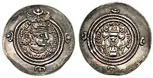 During her brief reign, Azarmidokht had coins minted with the image of her father on the obverse, with the inscription khwarrah abzūd ("Increase in Glory") and the winged crown representing Verethragna, the name of the god of victory.[15] On the reverse there is the regular late Sasanian fire-altar with two custodians.[15] Her reason for putting her father was not so due to her gender, as it was not so significant compared to the rulers relation to the royal Sasanian family, and most essentially to Khosrow II, who was considered the last proper and legitimate king of kings of Iran.[15] Azarmidokht's reason for minting coins with the image of her father was thus to restore his image and that of the Sasanian house, an attempt which was first made by Azarmidokht's sister, Boran, who did not however use an image of their father, but instead resorted to pay tribute to him by referring to him in her inscriptions.[16] However, at the time when Azarmidokht ascended the throne, an inscription may have not been enough, thus resulting in the placement of Khosrow II's image on the obverse of the coins.[8]