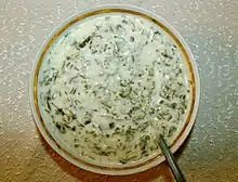 Dovga A yogurt-based soup with sorrel, spinach, rice, dried peas, and small meatballs made from ground mutton; served hot or cold depending on the season.[7]
