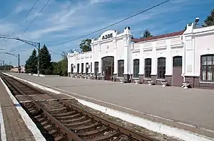 Azov (Russian: Азов) is a second class cargo-and-passenger railway station in Azov, Rostov oblast, Russia. It is a terminal station for the Rostov-on-Don — Azov railway. The station hosts freight and passenger suburban trains from Rostov-on-Don. Electric trains ER9 and railbuses RA1 make a passenger trips from Azov. Freight trains (to 100 wagons per day) deliver to the sea port coal, building materials, rubble, lumber and others. There are 45 persons working in the station.