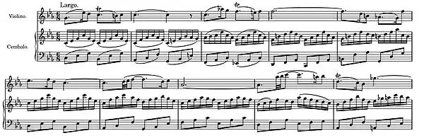 The Largo begins with a simple walking bass in the harpsichord which for the first three bars is annotated as a figured bass. The violin enters with the theme which is imitated in canon by the upper harpsichord part two bars later. The second complete statement of the theme is in the harpsichord with the canon in the violin, which passes into its "noble" lower register playing an expressive descending sequence of long sustained notes in suspension. It is during this passage that the third middle voice is first heard in the harpsichord playing semiquavers which dovetail with those of the main theme in the harpsichord, the combination of parts developing into a semiquaver accompaniment.