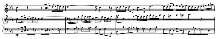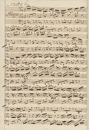 Although it had been believed for some time—and advanced as a theory by Eppstein (1966)—that the sonatas BWV 1014–1019 must have originated in lost trio sonatas for two instruments and continuo, no prior versions have been discovered and it is accepted that only a few movements could have such an origin. The first known source from 1725, in the handwriting of Bach's nephew Johann Heinrich Bach, explicitly specifies an obbligato harpsichord; and, despite the fact that a later version in the hand of Bach's pupil Johann Friedrich Agricola has a marginal "Violin I" at the start of BWV 1014, the scoring of the upper part in the keyboard, especially in the adagio movements BWV 1016/i, BWV 1017/iii and BWV 1018/iii, uses figures that are idiomatic to a keyboard instrument but unsuited to other instruments. Although this compositional style became widespread in the late eighteenth century, in Bach's day it was unusual and innovative. Although all the sonatas are written in trio sonata form, each has its own distinct character—the third is an example of the Sonate auf Concertenart, a sonata written in the style of a concerto.[4] Throughout his life Bach returned to the sonatas to refine and perfect the score, particularly in the last sonata, which survives in three different versions.[5]