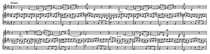 In the Adagio in triple time, the violin plays the cantabile melodic line in dotted rhythms in its lower and middle registers as if an alto solo. At first declamatory in the forte passages, the piano responses are expressive but subdued. Bach's knowledge of the expressive qualities of the violin is shown in the opening phrases, written so they can be played on the G string, the lowest string on the violin, regarded as having a "noble" tone. As Stowell (1990) explains, citing the opening of BWV 1017/3 as an example, the G string's "energy and powerful voice make it a whole instrument in itself and the lower this voice is, the more opportunity it gives to expression to attain the sublime." Around the violin melody, in the same registers, the right hand keyboard part weaves a dreamy accompaniment of broken chords in triplets. Below them the bass part punctuates the melody with a fragmented continuo-like accompaniment in quavers and crotchets. As Ledbetter (2002) comments, the complex and contrasting juxtaposition of rhythms, if played as annotated, has a magical effect. In the course of the movement there are six forte phrases of increasing complexity and length in the violin part each followed by a proportionate piano response. In the concluding four bar coda, the violin and harpsichord play semiquaver figures imitatively as the tonality modulates to G major, leading into the final Allegro. Eppstein (1966) describes the mood of the movement as "verinnerlichte und vergeistigte"—inward-looking and spiritual.[11]