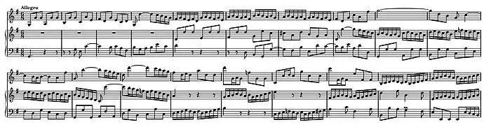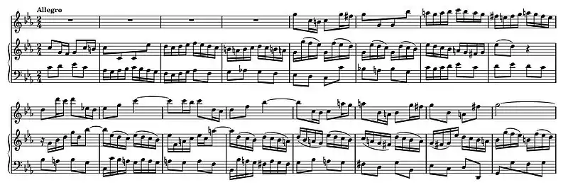• Tutti fugue. Contrary to Eppstein's choice of name, these do not start off with a "tutti" section: they commence with the fugue subject in one of the upper parts (violin or right hand of the harpsichord), accompanied by a non-thematic accompaniment in the bass, which can be a bare bass line or a figured bass. The fugue subject is then taken up by the other upper part and finally in the bass. These movements have countersubjects, solo episodes, fugal development sections and a ritornello at the close.