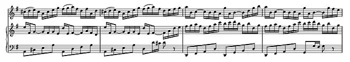 time, the third and central movement of BWV 1019 is an allegro in binary dance-form for solo harpsichord. Unlike the movements it replaced—the corrente and tempo di gavotta from the sixth keyboard partita, BWV 830—it cannot be identified with a particular dance. Although perhaps less brilliant than the sixth partita, the compositional style is comparable to Bach's keyboard writing of the 1730s that can be found in the binary preludes in Book 2 of the Well Tempered Clavier or some movements from the Overture in the French Style, BWV 831: the final piece in BWV 831 was also an unspecified dance movement with a similar function of showcasing the harpsichord. BWV 1019/3 is composed as a large scale movement with two and sometimes three voices. The semiquavers in the rhythmic theme are developed in extended passagework in both the upper and lower keyboard; after a development section and a recapitulation of the theme an octave lower, the second part concludes with semiquavers in parallel and contrary motion in both hands.[16]