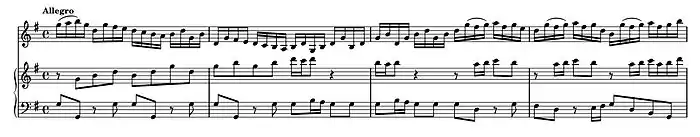 The opening movement is a concerto allegro in G major and common time. This already sets the sonata apart from the previous sonatas, which like the sonatas da chiesa of Corelli start with slow movements: BWV 1019, like the instrumental concertos of Bach, begins with a fast movement. Symmetrical in structure and written in strict da capo form, its opening 21 bar ritornello is scored as a tutti section for all three parts. The toccata-like semiquaver theme descending in the violin is matched by a rising quaver countersubject in the upper keyboard, with a rhythmic quasi-continuo in the bass line. The upper voices are written in invertible counterpoint in the ritornello, with the musical material alternating every two or four bars. The semiquavers continue unabated like a moto perpetuo throughout the ritornello, passing from one voice to another. After the first eight bars, when the main theme is heard twice, there is an eight-bar interlude when the violin and upper keyboard play in counterpoint, alternating between semiquaver motifs derived from the main theme and a syncopated countersubject.