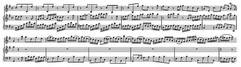 In the opening ritornello of 15+12 bars (see above) the fugue subject is first heard in the harpsichord, then the violin and finally in the bass line, when it is accompanied for two bars by the first statement of the countersubject—a rising sequence of repeated notes and trills—in the harpsichord. This is followed by the first episode of 10+12 bars in which motifs from the ritornello are developed between the upper parts in imitative responses and in parallel: rhythmic figures from the fugue subject are played in counterpoint to semiquaver passagework; and elsewhere the upper parts respond to each with trills. The ritornello then returns for seven bars with the fugue subject in the harpsichord. After the cadence, a pivotal two bar interlude introduces new motifs in all the parts: