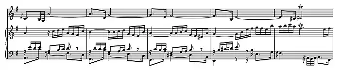time is a Siciliano, a binary dance-form widely used in the early eighteenth century. In the minor key it was associated with a mood of melancholy or even pathos. The elegiac melodic line and ornamentation are entirely suited to the violin. As numerous commentators have pointed out, with its affecting anapaests, the compositional style and impassioned tone resemble those of the obbligato violin solo in the celebrated alto aria "Erbarme dich" from Bach's St Matthew Passion. The harpsichord supplies a continuo-like accompaniment. There are arpeggiated semiquaver figures in the harpsichord right hand, while the quavers in the left hand—with their French tenue slurs gradually descending in steps—provide a rhythmic pulse gently driving the movement forward, almost like an ostinato bass.[9]
