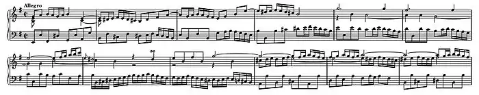 Whatever its origins, the conception of the newly composed Allegro matches that of the five other fugal last movements as well as the symmetry of the opening Allegro. The opening ritornello section is 30 bars long. After the statement of the three-bar fugue subject in the violin, it is taken up in the upper harpsichord part with the semiquaver counter subject in the violin. It is then heard in the bass with the counter-theme in the upper harpsichord. At bar 14 the fugue develops with an inverted version of the opening motif in the violin in counterpoint with semiquaver figures in the left hand of the harpsichord with responses in the right hand.