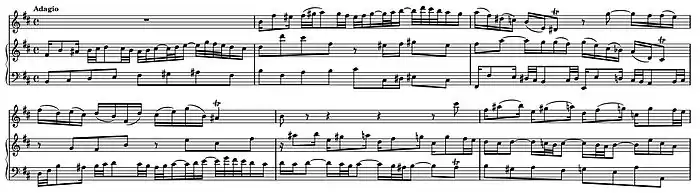 The fourth movement is an Adagio in B minor in common time. Of 21 bars in length, its tonal function is to mediate between the keys of the central and final movements (E minor and G major). The contrapuntal material of themes and counter-themes is shared and exchanged between all three parts; the long phrases in the main theme provide a soaring melody for the violin. The first version of the sonata also had an Adagio in B minor with a similar function but, as Richard Jones comments, the later replacement is "more elaborate and of greater expressive weight and substance." Asmus (1982) gives a detailed analysis of the musical structure of the Adagio, which alternates between two contrasting elements, the interplay between the two underlying the architecture of the movement. The first "arc-shaped" element is the fugue theme—florid, melodic, rhythmically complex and based around the tonic key. It is heard in the first bar in the harpsichord over a rising scale of quavers in the bass. An inverted version of the opening motif appears in the bass line in the third bar as the two upper voices play descending figures semiquaver couplets, which not only complete the melodic line of the fugue theme in the violin part but also provide a counter-theme. The second "rectilinear" element—more severe, chromatic and modulating—is first heard with its own counter-theme in the fifth bar. It is formed of a chain of motifs descending in crotchets, with syncopated rhythms related to those of the fugue theme. Time-wise the first element accounts for the majority of the movement, but the second element governs its tonal structure. Halfway through the movement in bar 11 the tonality reaches the relative major key of D major, but only fleetingly. The melody of the fugue subject and a variant of its completion return in the violin. After two bars of the chromatic syncopated material, the motifs of the fugue subject, broken up between all three voices, lead up to two cadences in F minor. The second element returns in the final two bar coda as the music modulates to the closing cadence in D major, in anticipation of the fifth movement in G major. [18]