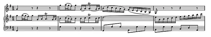 As this episode ends, the entire theme is heard once again but now in the bass line (in a slightly adapted form) with the violin in canon two bars later, resuming its descending sustained notes until the final cadence.[15]