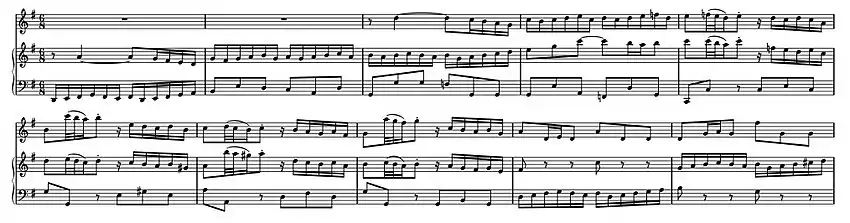 In the period 1700–1750, the trio sonata form became a sine qua non in the musical world. It incorporated all the ideals of harmony, melody and counterpoint espoused by theorists such as Mattheson, Scheibe and Quantz. In his treatise Der Vollkommene Capellmeister of 1739, Mattheson wrote that, ... es müssen hier alle drey Stimmen, jede für sich, eine feine Melodie führen; und doch dabey, soviel möglich, den Dreyklang behaupten, als obes nur zufälliger Weise geschehe: "Here each of the three voices must separately provide a fine melodic line; yet all the while together they must sustain as much as possible the three part harmony, as if by serendipity." Amongst all composers of that era, Bach was the one who raised the trio sonata form to its highest degree of perfection. In 1774 Bach's son Carl Philipp Emanuel commented that even after fifty years his father's compositions of this kind still sounded very good and that the lyricism of several of his adagios had never been surpassed. This continued veneration for these particular works even long after his death probably sprang not only from the fact that the form matched Bach's own compositional ideals—that all voices should "work wondrously with each other" (wundersam durcheinander arbeiten)—but also from the succeeding generation's preference for "sensitive" melodies. Perhaps even more influential was Bach's elevation of the harpsichord from a continuo instrument to a prominent obbligato instrument, on equal terms with the solo instrument, whilst also providing the bass line.[20] As Stowell (1992) comments, with his sonatas for violin and obbligato keyboard "Bach triggered off the gradual demise of the sonata for violin and continuo," even though it lived on in a few eighteenth century volin sonatas, for example those of Bach's German contemporaries Johann Adam Birkenstock, Johann David Heinichen, Gottfried Kirchhoff and Johann Georg Pisendel. [21]