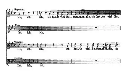 Fourth movement. The last movement of Op.3, No.11 is composed in ritornello ABA form. In the opening bars the first and second violins play in tutti the opening theme with its repeated quavers and clashing dissonances. Bach used the same theme for the opening chorus of his cantata Ich hatte viel Bekümmernis, BWV 21, first performed on 17 June 1714, shortly before ill health forced Prince Johann Ernst to leave Weimar for treatment in Bad Schwalbach.