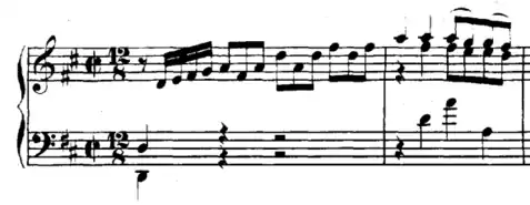 The episodes of the fugue are in a canonic texture, and in these episodes, the motif grows from six notes in bar 7 to eight notes in bar 16, to a two-octave descending scale in bars 38–40. While the fugue is in cut time, the notes used are mainly crotchets and quavers, rather than minims and crotchets, to suggest that the piece should be lively in performance.[4] Below are the first two statements of the fugue's subjects: