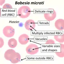 Babesiosis or piroplasmosis is a malaria-like parasitic disease caused by infection with a eukaryotic parasite in the order Piroplasmida, typically a Babesia or Theileria, in the phylum Apicomplexa.[2] Human babesiosis transmission via tick bite is most common in the Northeastern and Midwestern United States and parts of Europe, and sporadic throughout the rest of the world. It occurs in warm weather.[3] People can get infected with Babesia parasites by the bite of an infected tick, by getting a blood transfusion from an infected donor of blood products, or by congenital transmission (an infected mother to her baby).[4] Ticks transmit the human strain of babesiosis, so it often presents with other tick-borne illnesses such as Lyme disease.[5] After trypanosomes, Babesia is thought to be the second-most common blood parasite of mammals. They can have major adverse effects on the health of domestic animals in areas without severe winters. In cattle the disease is known as Texas cattle fever or redwater.[6]