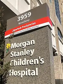 Morgan Stanley Children's Hospital of NewYork-Presbyterian (MSCH or CHONY[3]) is a women's and children's hospital at 3959 Broadway, near West 165th Street, in the Washington Heights neighborhood of Manhattan, New York City. It is a part of NewYork-Presbyterian Hospital and the Columbia University Irving Medical Center. The hospital treats patients aged 0–21[4][5][6] from New York City and around the world.[7][8] The hospital features a dedicated regional ACS designated pediatric Level 1 Trauma Center and is named after financial firm Morgan Stanley, which largely funded its construction through philanthropy.