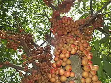 Baccaurea motleyana is a species of fruit and fruit tree which grows wild in parts of Southeast Asia and is cultivated for its fruit in Bangladesh, Indonesia, Thailand and Peninsular Malaysia. Its common names include rambai and rambi, and in Thai language mafai-farang. In the Bengali language the fruit is known as bugi as local language in Narsingdi like lotka, lotkon or bugi in Bengali locally (লটকা/লটকন/বুগি), in the Assamese language it is known as leteku (লেটেকু). This is a tree generally growing to 9 to 12 meters (30 to 39 ft) in height with a short trunk and a broad crown. The evergreen leaves are shiny green on the upper surface and greenish-brown and hairy underneath. Each leaf is up to 33 centimeters (13 in) long and 15 centimeters (5.9 in) wide. The species is dioecious, with male and female flowers growing on separate individuals. Both types of flowers are fragrant and have yellow sepals. The staminate racemes are up to 15 centimeters (5.9 in) long and the pistillate inflorescences may reach 75 centimeters (30 in) in length. The fruits are each 2 to 5 centimeters (0.79 to 1.97 in) long and about two wide and grow in strands. Each fruit has velvety pinkish, yellow, or brown skin which wrinkles at ripening and is filled with whitish pulp containing 3 to 5 seeds. The pulp is sweet to acid in taste. They may be eaten raw or cooked or made into jam or wine. The tree is also used for shade and low-quality wood.