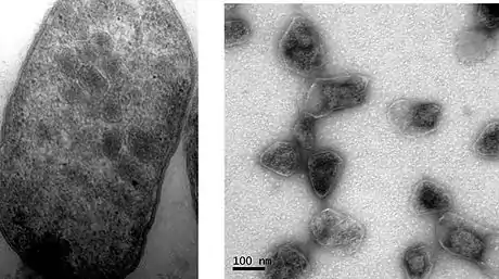 The first BMCs were observed in the 1950s in electron micrographs of cyanobacteria,[18] and were later named carboxysomes after their role in carbon fixation was established.[19] Until the 1990s, carboxysomes were thought to be an oddity confined to certain autotrophic bacteria. But then genes coding for proteins homologous to those of the carboxysome shell were identified in the pdu (propanediol utilization)[20] and eut (ethanolamine utilization)[21] operons. Subsequently, transmission electron micrographs of Salmonella cells grown on propanediol[22] or ethanolamine[23] showed the presence of polyhedral bodies similar to carboxysomes. The term metabolosome is used to refer to such catabolic BMCs (in contrast to the autotrophic carboxysome).