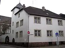 In the Middle Ages, the eastern part of today's Poststraße in the New Town was the Judengasse ("Jews' Lane"). The Kleine Judengasse ran from the Judengasse to what is today called Magister-Faust-Gasse.[27] In 1482, a "Jewish school" was mentioned, which might already have stood at Fährgasse 2 (lane formerly known as Kleine Eselsgass – "Little Ass's Lane"), where the Old Synagogue of Bad Kreuznach later stood (first mentioned here in 1715; new Baroque building in 1737; renovated in 1844; destroyed in 1938; torn down in 1953/1954; last wall remnant removed in 1975). In 1525, Louis V, Elector Palatine allowed Meïr Levi[28] to settle for, at first, twelve years in Kreuznach, to organise the money market there, to receive visits, to lay out his own burial plot and to deal in medicines. In the earlier half of the 16th century, his son, the physician Isaak Levi, whose collection of medical works became well known as Des Juden buch von kreuczenach ("The Jew's Book of/from Kreuznach"), lived in Kreuznach. The work is preserved in a manuscript transcribed personally by Louis V, Elector Palatine.[29] The oldest Jewish graveyard in Kreuznach lay in the area of today's Rittergut Bangert (knightly estate), having been mentioned in 1525 and 1636.[30] The Jewish graveyard on Stromberger Straße was bought in 1661 (one preserved gravestone, however, dates from 1630) and expanded in 1919. It is said to be one of the best preserved in Rhineland-Palatinate. The Jewish family Creizenach, originally from Kreuznach, is known from records to have been in Mainz and Frankfurt am Main from 1733, and to have produced a number of important academics (Michael Creizenach, Theodor Creizenach, and Wilhelm Creizenach).[31] The Yiddish name for Kreuznach was צלם־מקום (abbreviated צ״מ), variously rendered in Latin script as Zelem-Mochum or Celemochum (with the initial Z or C intended to transliterate the letter "צ", as they would be pronounced /ts/ in German), which literally meant "Image Place", for pious Jews wished to avoid the term Kreuz ("cross").[32] In 1828, 425 of the 7,896 inhabitants of the Bürgermeisterei ("Mayoralty") of Kreuznach (5.4%) adhered to the Jewish faith, as did 611 of the town's 18,143 inhabitants (3.4%) in 1890.