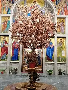 While blessing the badnjak, some priests chant the following prayer: "O Lord Jesus Christ, our God, who did plant the Tree of Life in paradise so that it might bestow upon us eternal blessedness, bless also now this tree which is a symbol of Thy cross and the Tree of Life in paradise, and which reminds us of Thy holy birth and of the logs which the shepherds of Bethlehem kindled to warm themselves when they came to worship Thee, the divine infant, and thereby prefigured Thy salvation-bearing cross."[18]