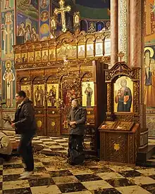The ritual is the central part of the celebration. Vespers vary from place to place with respect to the time of the beginning of the service, its length and structure. The laying of the badnjak on the fire usually comes after the service, and is done by a priest or by a respected parishioner. Before the burning, the tree may be processionally carried around the church. In the case of more than one badnjak, the trees are placed in the shape of a cross. The assembled devotees throw then into the fire their twig bunches, each representing a small badnjak. The consecration or blessing is performed by a priest: he strews wheat grains over the badnjak, censes it while singing the Troparion of the Nativity, and as he intones prayers, he pours wine and spreads honey on it. Instead of applying wine and honey, holy water may be sprinkled on the tree by dipping a bunch of basil into a bowl with the water. This rite is generally performed after the placing on the fire, although it may happen before, in which case the consecration may be performed in the church itself or in its yard.[17][18]