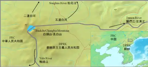 Paektu Mountain or Baekdu Mountain (Korean: 백두산) is an active stratovolcano on the Chinese–North Korean border.[3] In China, it is known as Changbai Mountain (Chinese: 长白山). At 2,744 m (9,003 ft), it is the tallest mountain in North Korea and Northeast China and the tallest mountain of the Baekdu-daegan and Changbai mountain ranges. The mountain notably has a caldera that contains a large crater lake called Heaven Lake, and is also the source of the Songhua, Tumen, and Yalu rivers. Korean and Manchu people assign a mythical quality to the mountain and its lake, and consider the mountain to be their ancestral homeland.