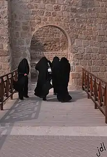 The traditional garments of women in Bahrain include the jellabiya, a long, loose dress, which is one of the preferred clothing styles for the home. Bahraini women may practice the muhtashima, partially covering the hair, or the muhajiba, fully covering the hair.[5]