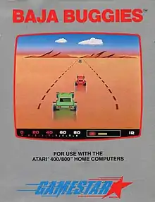 Baja Buggies is a desert-themed racing video game written by Dan Ugrin for the Atari 8-bit family.[1] It uses a third-person, 2.5D perspective. The game was originally developed and sold as Night Rally by Arcade Plus before the company folded, then it was revamped and became the first release from Gamestar.[2][3] Gamestar went on to publish a series of sports games for the Atari 8-bit and Commodore 64 before becoming a label of Activision.