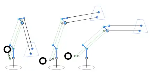 The short arms (green) stay parallel. One spring puts pull force on the blue arm. (If the blue arm is tilted back the second spring on this arm gets push force.) The blue arm controls the two parallel arms (red) that make up the upper arm. The other spring puts pull force on the other blue arm. This arm controls the forearm (magenta). The two springs can be the same size; one spring has to lift more weight but is more vertical. The other spring lifts less weight but is more horizontal.