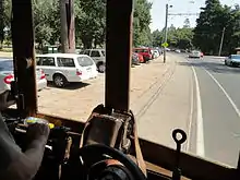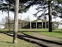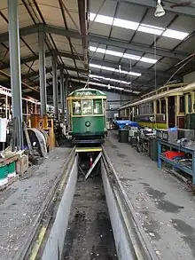 A new tram depot was built as the original depot site was sold in June 1972.[5] The City of Ballarat provided land in the South Gardens Reserve. Six Ballarat trams which had been stored in the old depot had to be towed around Lake Wendouree to the new site. An access track was laid and the trams were hand winched into the new shed. In July 1974 a new substation was built to supply DC current to the trams.[5] On 12 October 1974, Tram No. 27 was able to make several trips along the access track.[5] During November and December 1974 a track was laid to join the new depot to existing tram tracks in Wendouree Parade. This was quite a complex operation as the rails had to be bent to a curve by the Melbourne & Metropolitan Tramways Board's South Melbourne workshops and transported to Ballarat. Wendouree Parade had to be dug up and the new track laid.[5]
