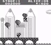 In 1-player mode, the gameplay is an arrangement of the Balloon Trip mode of Balloon Fight, where the screen automatically scrolls toward the left, while the player controls Alice that uses two balloons to float into the air with. To make her float in the air, the player must press (and sometimes hold) the A button to make her wave her arms to hover upward. Alice also has the ability to remove her balloons and walk on the ground, as well as jumping. If both of her balloons are popped or removed, and if she lands safely, she can inflate two new balloons and fly again.