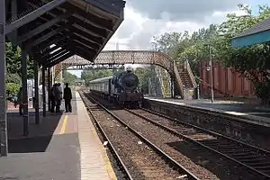 The station was rebuilt between 1901 and 1902 to designs by Berkeley Deane Wise in a Cottage style. The cast ironwork forming the station canopy was provided by MacFarlane's Saracen Foundry of Glasgow, and the cast iron footbridge was provided by the Sun Foundry of George Smith and Company in Glasgow.