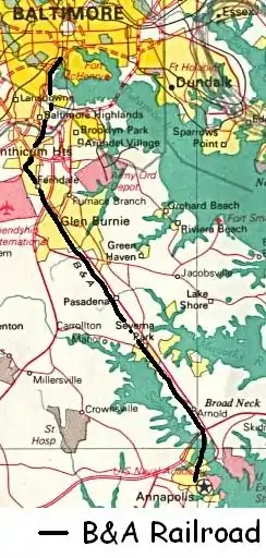The Baltimore & Annapolis Railroad was an American railroad of central Maryland built in the 19th century. The railroad, the second to serve Annapolis, ran between Annapolis and Clifford along the north shore of the Severn River. From Clifford, just north of the present day Patapsco Light Rail Stop, it connected with the B&O's Curtis Bay branch so that trains could travel to Baltimore. In 1921, when it was called the Annapolis and Baltimore Short Line, it was purchased by the larger Washington, Baltimore and Annapolis Electric Railway (WB&A), and then emerged from the WB&A's 1935 bankruptcy and closure as the Baltimore & Annapolis Railroad. B&A electric passenger operation between the two cities continued until 1950, at which time the rail line became solely a freight carrier, operating buses for passenger service. Freight service to Annapolis continued until June 1968 when the Severn River Trestle was declared unsafe. In the 1980s, the line was completely shut down. The right-of-way now serves as part of Baltimore's light rail system and as the Baltimore & Annapolis Trail.