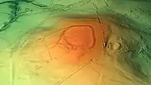 There is an original entrance on the west side, protected by an external bank 15 metres (49 ft) wide and 1 metre (3.3 ft) high, with traces of an external ditch. This bank, branching out from the north west part of the rampart, runs south-west and then curves towards the fort, so that there is a passage into the fort from the south, at one point down to about 2 metres (6.6 ft) wide.[1][2]
