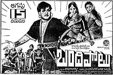 Bandipotu (transl. Bandit) is a 1963 Indian Telugu-language swashbuckler film directed by B. Vittalacharya. It stars N. T. Rama Rao and Krishna Kumari, with music composed by Ghantasala. Tripuraneni Maharadhi wrote the story and dialogues. The film was produced by Sunderlal Nehataa and Doondy under the Raja Lakshmi Productions banner. Vittalacharya shot the film simultaneously in Kannada as Veera Kesari (1963), with Rajkumar.[1][2] This film had its climax scene in Eastmancolor.