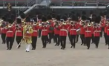 As the Escort to the Colour slow-marches down the field towards No. 6 Guard to begin their colour trooping, the massed bands perform a maneuver unique to their unit and the Royal Marines[6] known as the anti-clockwise "spinwheel". It is a 90° turn in restricted space, and is the specific responsibility of the Garrison Sergeant Major.