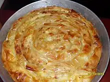 Banitsa (Bulgarian: баница), also transliterated as banica and banitza, is a traditional pastry dish made in Bulgaria. In various regions, this traditional pastry dish takes on different names. In Budjak, North Macedonia, and Southeastern Serbia, it is known as gibanica, also called milina by Bulgarians in Ukraine.[1] Prepared by layering a mixture of whisked eggs, natural yogurt and pieces of white brined cheese between filo pastry and then baking it in an oven.