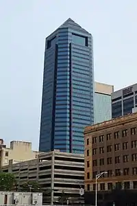 Bank of America Tower (originally Barnett Center) is a skyscraper in the downtown area of Jacksonville, Florida, at the northwest corner of Bay and Laura streets. At 617 ft (188 m), it is the tallest building in Jacksonville,[1] the 25th-tallest in Florida, and the tallest building in Florida outside of the Miami metropolitan area. It was built as the headquarters of Barnett Bank and originally named Barnett Center, but the name was changed to NationsBank Tower in 1998 after Barnett Bank was acquired by NationsBank. NationsBank was soon acquired by Bank of America and the building's name was changed to Bank of America Tower in 1999. The 42-floor structure was designed by German-American architect Helmut Jahn, and is constructed of reinforced concrete.