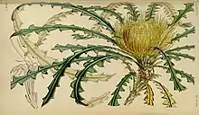 In addition to plant specimens, Drummond also sent seeds of D. nobilis to England. Plants were raised from Drummond's seeds, and in 1852 one of them flowered, making D. nobilis one of only two dryandras known to have flowered in Europe from Drummond's seed. The flowering specimen was about seven years old at the time, and about four feet high. It became the basis for a lithographed plate by Walter Hood Fitch, which was featured in Volume 78 of Curtis's Botanical Magazine.[6] By this time, however, the enthusiasm for Proteaceae that prevailed among horticulturalists in the 1840s had waned, and D. nobilis would be the last dryandra to feature in Curtis's Botanical Magazine.[2]