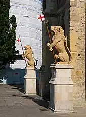 The room above the gate itself was probably added shortly after 1400 and the town steward books mention a banquet held there in 1434.[12] It was originally used as the city's guildhall, until the 1770s.[13] It was at this point that the city began to grow to the north of the gate.[14] Also during the 18th century, five panels containing painted shields and the sundial were added to the building and in the middle of the century the old wooden lions were replaced with new lead sculptures.[4][9]