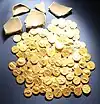 Most Roman hoards are composed largely or entirely of coins, and are relatively common in Britain, with over 1,200 known examples.[1] A smaller number of hoards, such as the Mildenhall Treasure and the Hoxne Hoard, include items of silver or gold tableware such as dishes, bowls, jugs and spoons, or items of silver or gold jewellery.