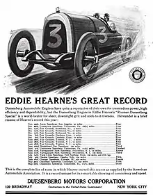 The Roamer was marketed from its inception as "America’s Smartest Car." It was also successful in many early racing events. A Roamer with a Rochester-Duesenberg engine driven by chief engineer L. F. Godspeed and Eddie Hearne set six records for one kilometer and one through five-mile sprints at Daytona Beach in 1921. The advertisements crowed, "America’s Smartest Car Makes America’s Fastest Mile."[3]