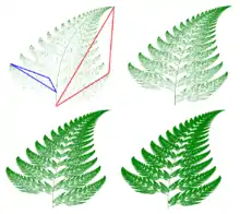 The first point drawn is at the origin (x0 = 0, y0 = 0) and then the new points are iteratively computed by randomly applying one of the following four coordinate transformations:[4][5]