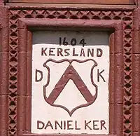 Over the main entrance door of the dwelling house is a carved stone removed from the old manor house bearing the arms of the Ker family, with an inscription "Daniel Ker Kersland - 1604". This date stone has been touched-up with paint.[6] Karrisland (sic) is recorded on Timothy Pont's map c.1604, as are the placenames Karshead, Todsle, Dysil, and Achingry.[7] In 1685 'Carsland' is shown.[8] The property had been surrounded by trees and had a orchard of considerable extent.[9] Kersland Mains was on the entrance lane from Dalry and became Wester Kersland Farm when the manor house/castle was demolished.