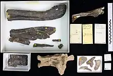 Most of the bones collected were encased in siltstone nodules surrounded by fine sand and silt, with the rest lying in clay. The bones were disarticulated and scattered over a 5-by-2-metre (16.4-by-6.6-foot) area, but most were not far from their natural positions. The position of some bones was disturbed by a bulldozer, and some were broken by mechanical equipment before they were collected.[3][1][6] Preparing the specimen was difficult, due to the hardness of the siltstone matrix and the presence of siderite; acid preparation was attempted, but most of the matrix was removed mechanically. It took six years of almost constant preparation to get all the bones out of the rock, and by the end, dental tools and air mallets had to be used under a microscope. The specimen represents about 65 per cent of the skeleton, and consists of partial skull bones, including premaxillae (first bones of the upper jaw); the left maxillae (second bone of the upper jaw); both nasal bones; the left lacrimal; the left prefrontal; the left postorbital; the braincase including the occiput; both dentaries (the front bones of the lower jaw); various bones from the back of the lower jaw; teeth; cervical (neck), dorsal (back), and caudal (tail) vertebrae; ribs; a sternum; both scapulae (shoulder blades); both coracoids; both humeri (upper arm bones); the left radius and ulna (lower arm bones); finger bones and unguals (claw bones); hip bones; the upper end of the left femur (thigh bone) and lower end of the right; right fibula (of the lower leg); and foot bones including an ungual.[3][1][7][2] The original specimen number was BMNH R9951, but it was later re-catalogued as NHMUK VP R9951.[1][8]