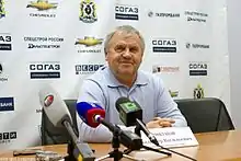 Barys was founded on 26 November 1999 as the result of resolution accepted by the City Council of Astana.[7] The team was gathered in a semi-professional level by an enthusiast players who were annually playing an amateur tournament for the prize of Mayor of Astana and professional players who came from other teams of the Championship.[8] The team's name, Barys, is derived from the national symbol of Kazakhstan, translated as snow leopard.[9][10] Nikolai Myshagin became the first head coach in the club's history.[11] Under Myshagin rule, Barys earned silver medals in its first three season of play in the Kazakhstan Hockey Championship.[12] Barys would stay there until 2009.[11] During the 2003–04 season, Barys squaded by junior players to serve as a base club for the Kazakhstan national junior ice hockey team.[11] In 2004, Barys was admitted into the Russian ice hockey system. They made their debut in the Pervaya Liga; in parallel, Barys kept a second team in the Kazakhstan Hockey Championship.[11] Barys' debut in Russia was interesting, with the team doing fairly well.[11] They played three seasons in the Pervaya Liga, where they finished respectively third, second and first of the Ural-Western Siberia Zone where they played. With this first place in 2007, Barys was allowed into the Vysshaya Liga.[11]