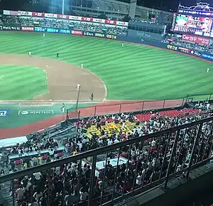 The baseball cheering culture in South Korea started in the 1990s and continues to the present.[1] There are 10 professional clubs and each club has its own way of cheering.[2] The Korean cheering culture generally shares similar characteristics: collective, enthusiastic and empathetic. Baseball cheering is popular because of easy-to-learn fight songs, break-time events and a variety of foods. Baseball cheering is performed in most parts of a ballpark.[3][4][5]