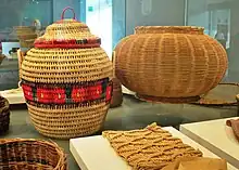 The Seri people in Sonora have one of the best-known basketry traditions, with the most important items being a kind of basket called the corita.[1] Until the popularity of ironwood carvings, baskets were the main notable craft of the Seri.[10] Coritas are mad with the branches of a brush or bush called torote (jatropha cuneatas), which grows in the desert.[1] Except for shoulder yokes used to carry bundles on the back, baskets were used to transport everything except liquids by the Seri. Shallow baskets were carried on the head by Seri women, balanced by the use of a head ring and carried everything from wood, harvests, meat and clothes. Baskets were used for winnowing and storage. The served as suitcases, buckets and refuse containers.[10]